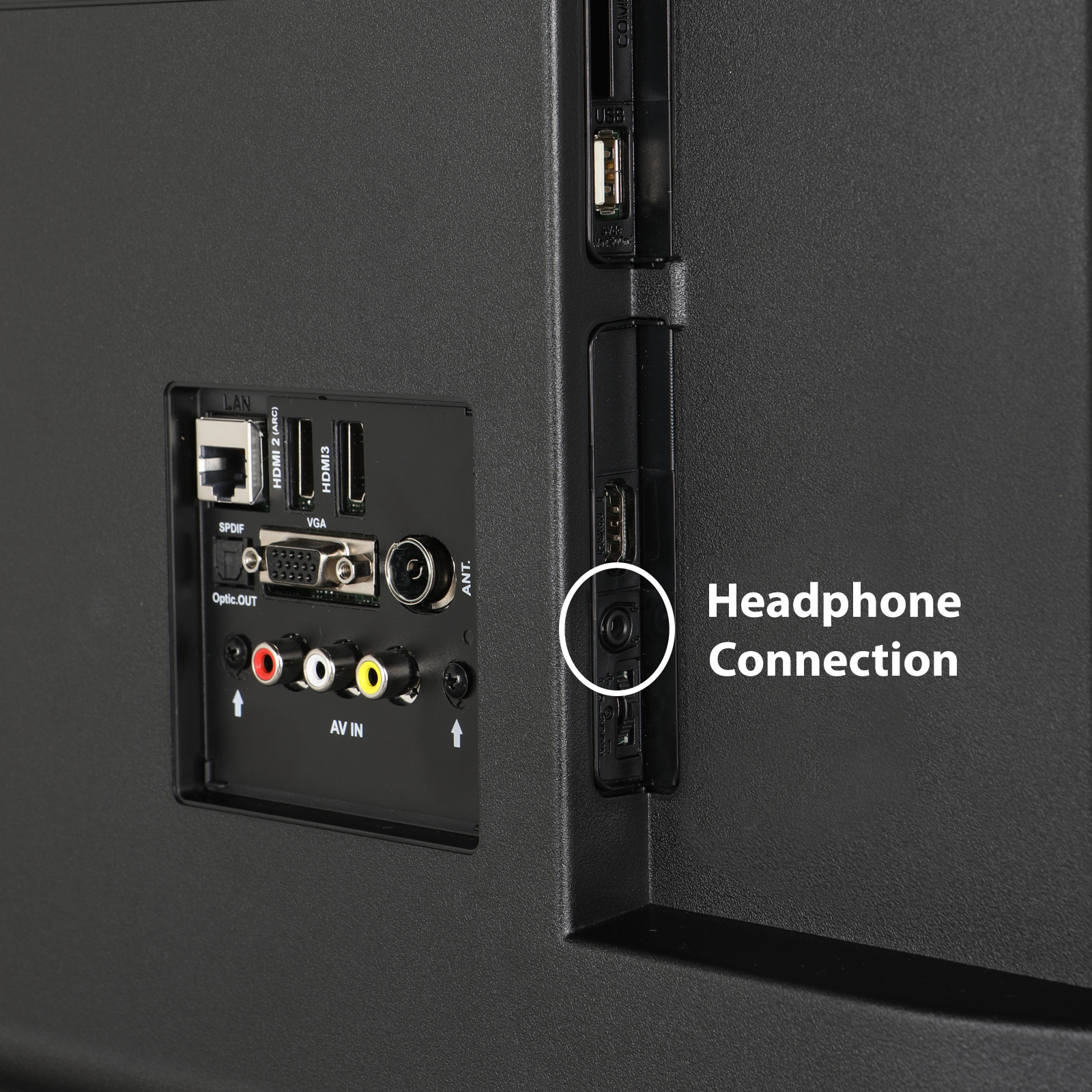 All our TVs have a 3.5mm headphone jack socket. When the headphones are plugged into the TV, the sound will mute from the internal TV speakers.